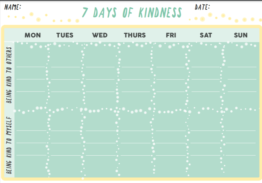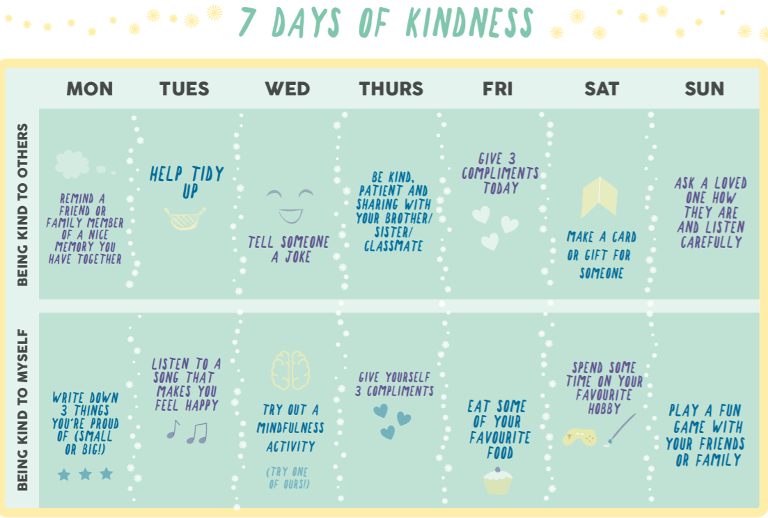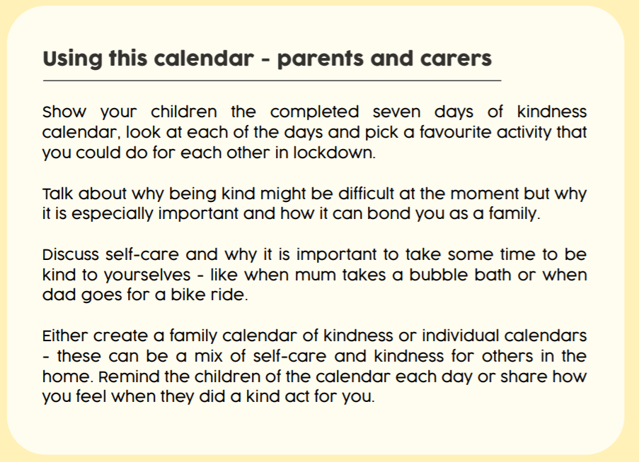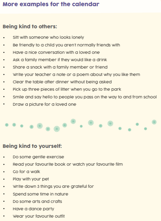 You may also want to share ideas or explain why it’s important to be kind. You can use the kindness calendar to help you if you like!